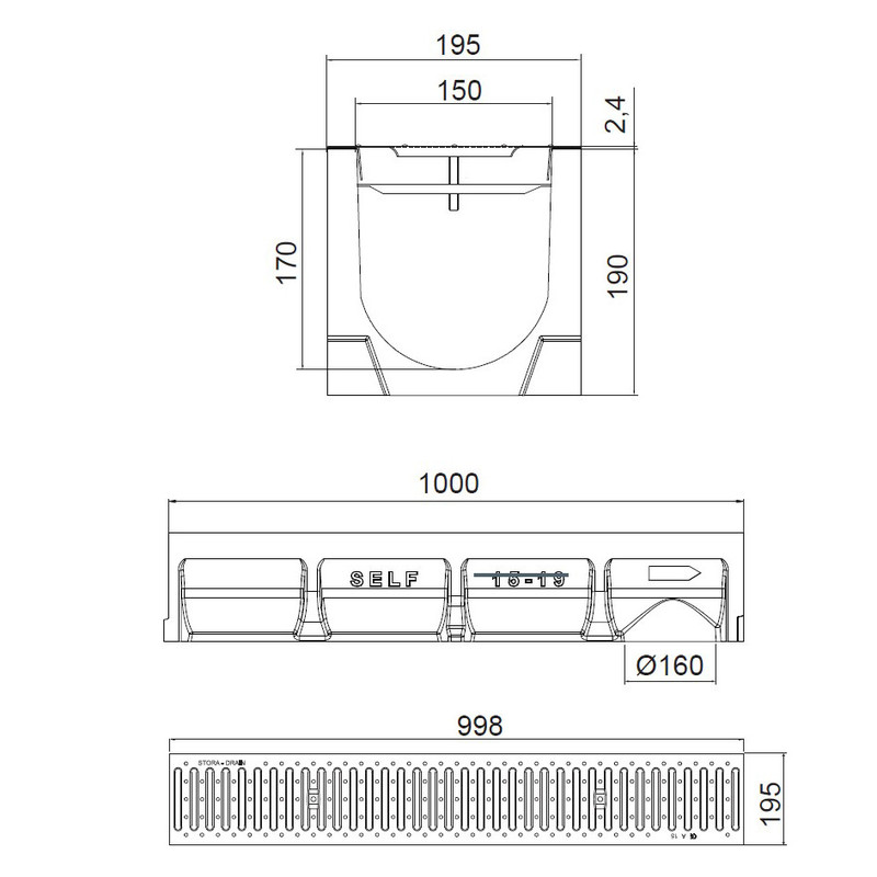 Caniveau de drainage en béton polymère largeur 150, hauteur 190