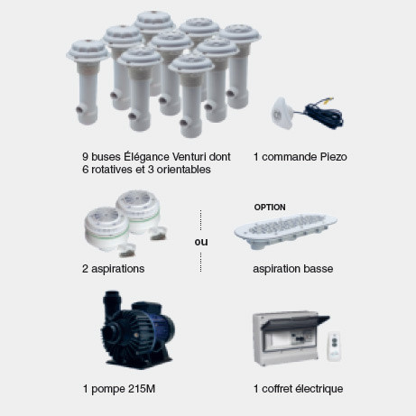 Composition du kit : • 9 buses Élégance Venturi dont 6 rotatives et 3 orientables - liner • 1 commande Piezo • 2 aspirations (aspiration basse en option) • 1 pompe 215M • 1 coffret ... Plus de détails