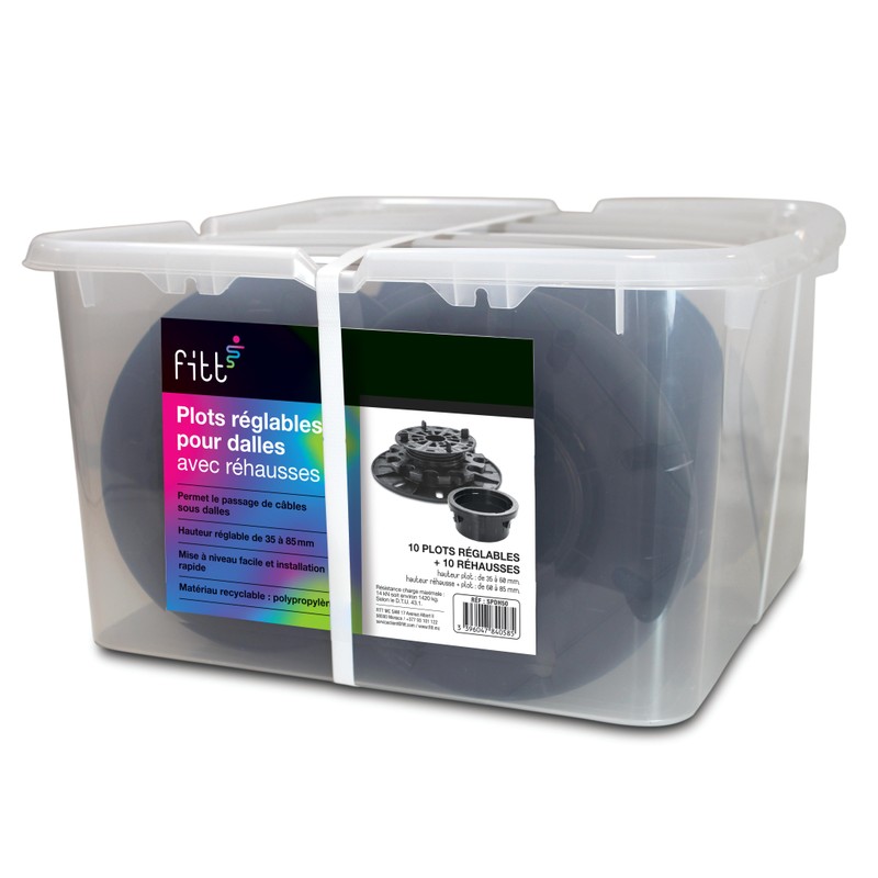 Hauteur réglable du plot : de 35 à 60 mm. Hauteur réglable du plot + réhausse : de 60 à 85 mm. Permet le passage de câbles sous dalles. Matériau recyclable : polypropylène. Résistance charge ... Plus de détails